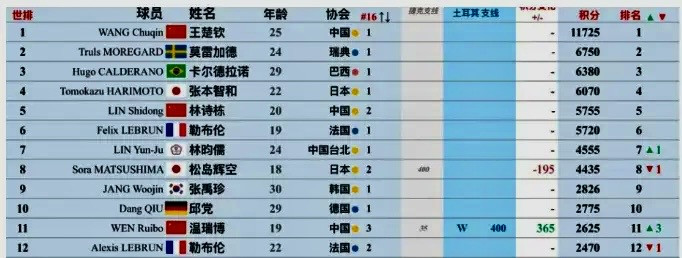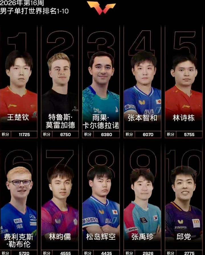 目前男队的前十,王楚钦稳居首位,莫雷加德、雨果、张本智和、林诗栋、分别在前五;第六至十的是:小.勒布伦、林昀儒、松岛辉空、张禹珍、邱党。欧洲瓜分四位名额,国乒占席两位,可见外协飞跃成长。