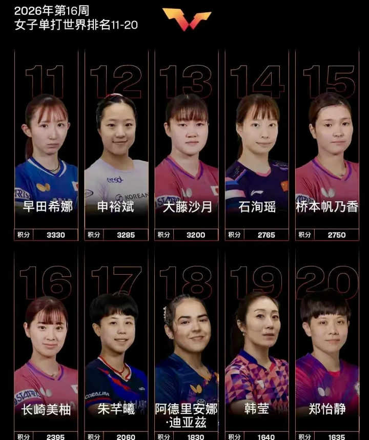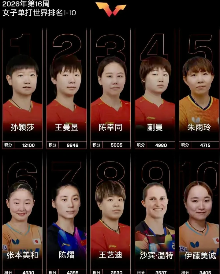 反观女队那边排名,国乒依然是统治者,包揽四强。孙颖莎、王曼昱稳居前二,陈幸同蒯曼第三第四、朱雨玲第五;第六至第十:张本美和、陈熠、王艺迪、温特、伊藤美诚